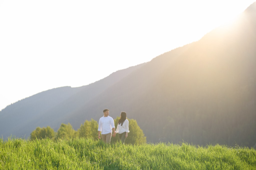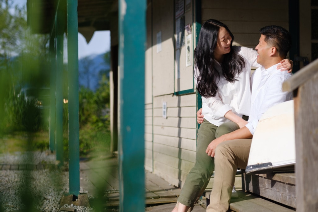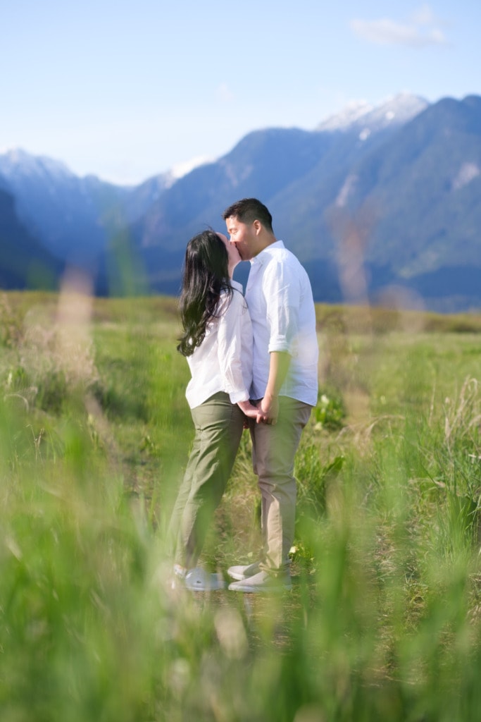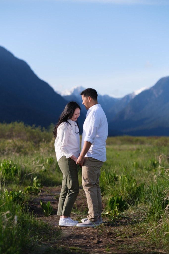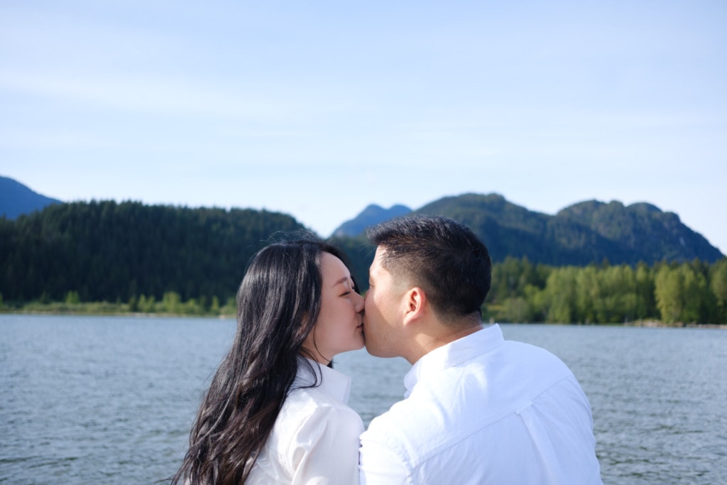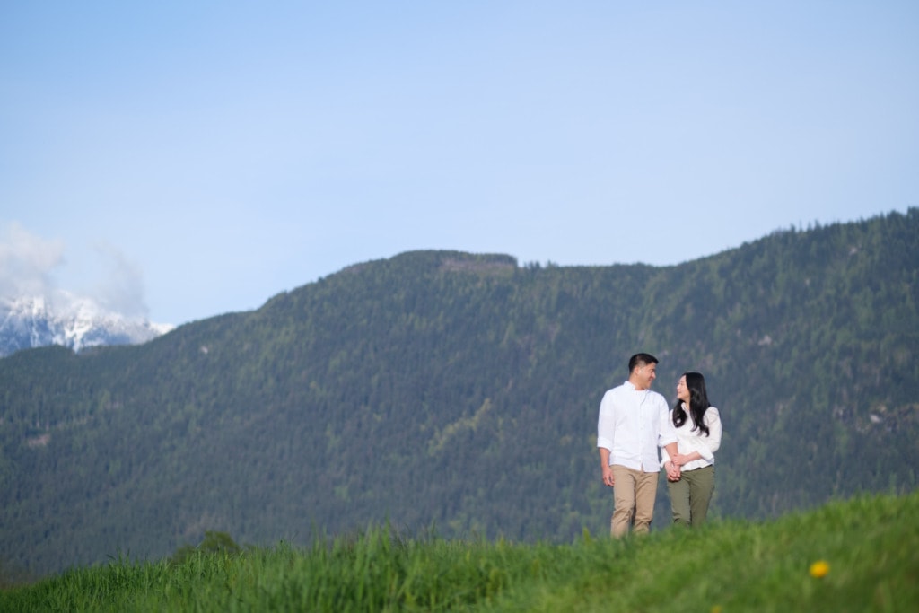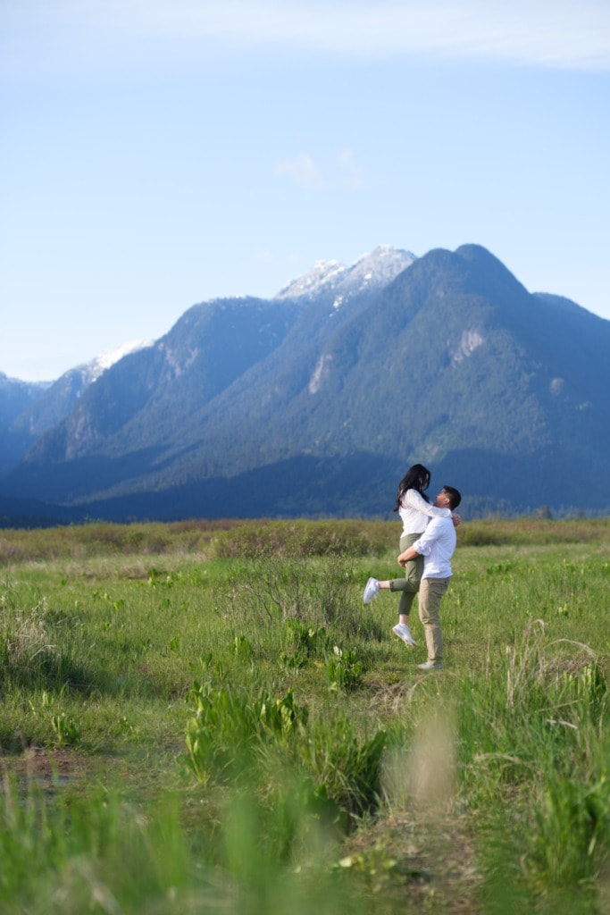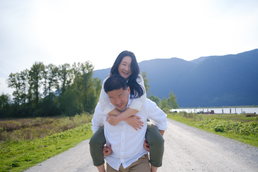 I had photographed Charles & Ellen’s surprise proposal the previous year in the fall and Ellen wanted some spring photos for their save-the-date invitation. I had a lot of fun capturing their surprise engagement as the two of them are super silly. I knew this session would be great as well. Ellen suggested Pitt Lake in Pitt Meadows for the engagement photos which was an excellent choice for some spring photos. The location is a bit far from Vancouver but if you’re willing to drive out to Pitt Lake on a beautiful day, you will be rewarded with some amazing photos. It’s a very popular place for engagement photographers in Vancouver. The light is just gorgeous during sunset. The mountains and lake make for some the best engagement photos in Vancouver. That can be said about almost any location around Vancouver or BC!