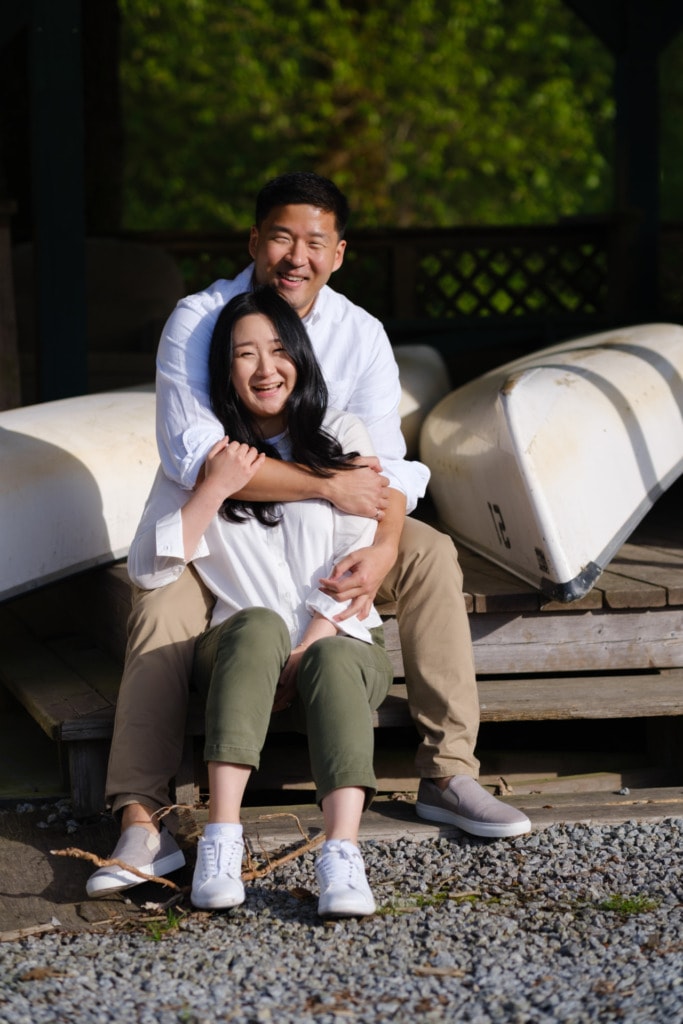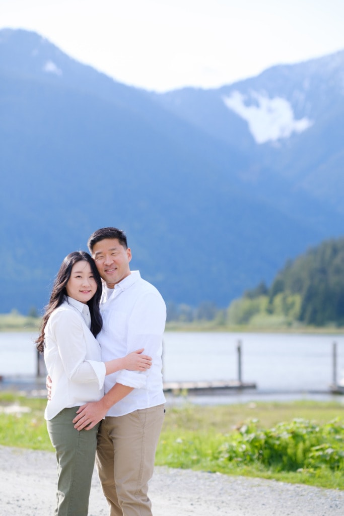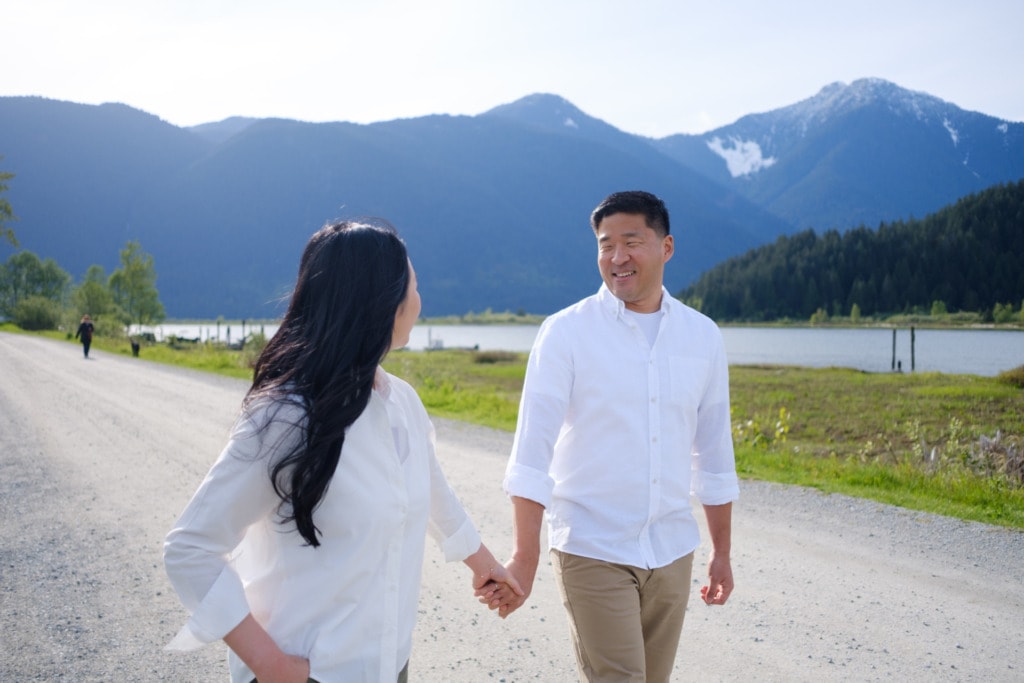 I had photographed Charles & Ellen’s surprise proposal the previous year in the fall and Ellen wanted some spring photos for their save-the-date invitation. I had a lot of fun capturing their surprise engagement as the two of them are super silly. I knew this session would be great as well. Ellen suggested Pitt Lake in Pitt Meadows for the engagement photos which was an excellent choice for some spring photos. The location is a bit far from Vancouver but if you’re willing to drive out to Pitt Lake on a beautiful day, you will be rewarded with some amazing photos. It’s a very popular place for engagement photographers in Vancouver. The light is just gorgeous during sunset. The mountains and lake make for some the best engagement photos in Vancouver. That can be said about almost any location around Vancouver or BC!